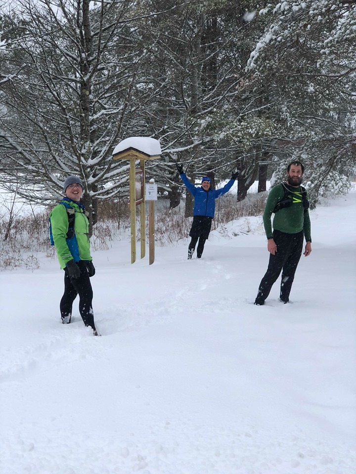 My inner Bucky screamed at me as we trudge those first few steps, grab the snow shoes!, but no one else seemed to mind and I didn’t want to be the one guy. Well, after running on a snow shoe trail laid by one of the guy’s moms for a 1/2 mile or so there is no doubt in my mind that had a put on my pair and blazed the trails everyone would have been very grateful and we would have made better progress. We earned every step, as we bounded through the snow finding that in most locations no one else had been on the trails that morning and it was up to use to forge ahead.
