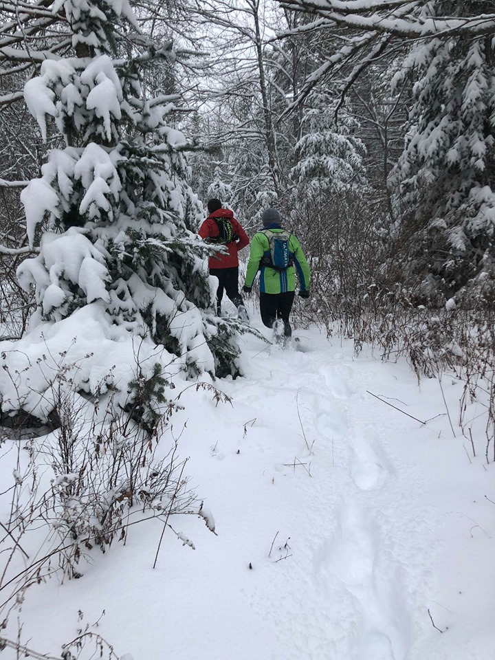 The bonus of the roads was a break on the legs from snow hopping and high knees, but the few sections were short lived and it was never long before one of us was going through the waist deep road embankment to start another slog through snowy trails. It is hard to appreciate the serene beauty you are surrounded when your head is tipped down and you doing your best to either blaze a trail or step in the prints of the guy in front of you. When our heads weren’t down, or when we weren’t zigzagging to avoid the bent over snow covered branches, I don’t think any of us got out of the woods without getting dumped on at least once, we did get the pleasure of seeing many deer tracks, and an owl.